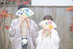 扇子でお顔を隠すニュアンスショットも。ちらっとお顔を出したショットもかわいかったです♡