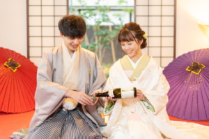 やさしい光に包まれて、お神酒をいただいているかのような1枚*。おふたり愛用のお猪口をお持ちいただきました♡